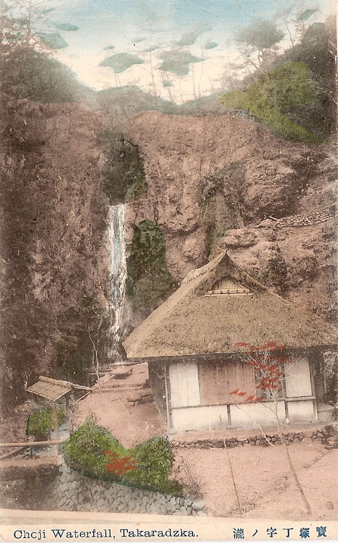 丁字瀧は、「寳塚温泉案内」は丁子ヶ瀧と表示されていますが、絵葉書では、丁字瀧、丁字ノ瀧と記載されているものが多く見られます。昭和時代初期には長壽ヶ瀧と称された時期もあるようで、滝の側に「長壽ヶ瀧」の碑、茶亭に「長壽亭」の提灯が写った絵葉書があります。